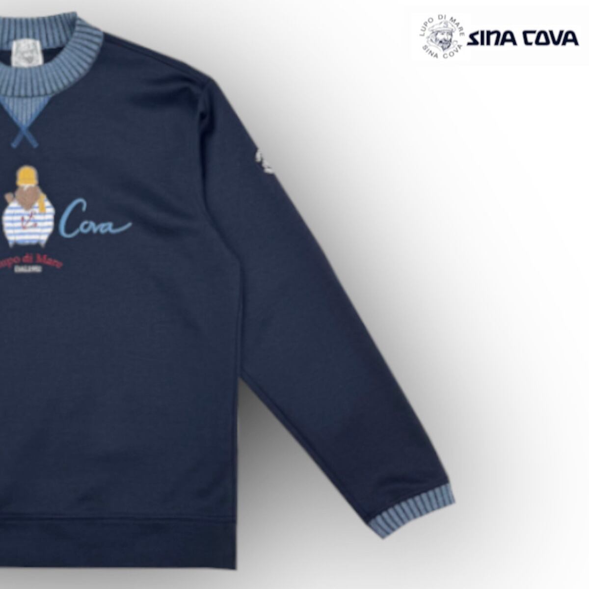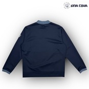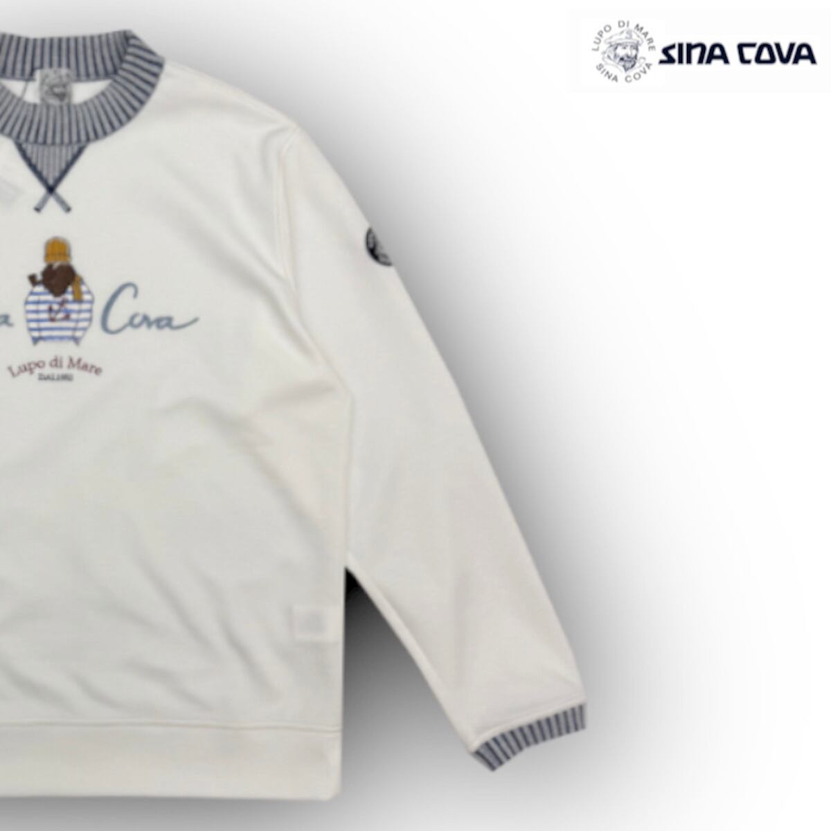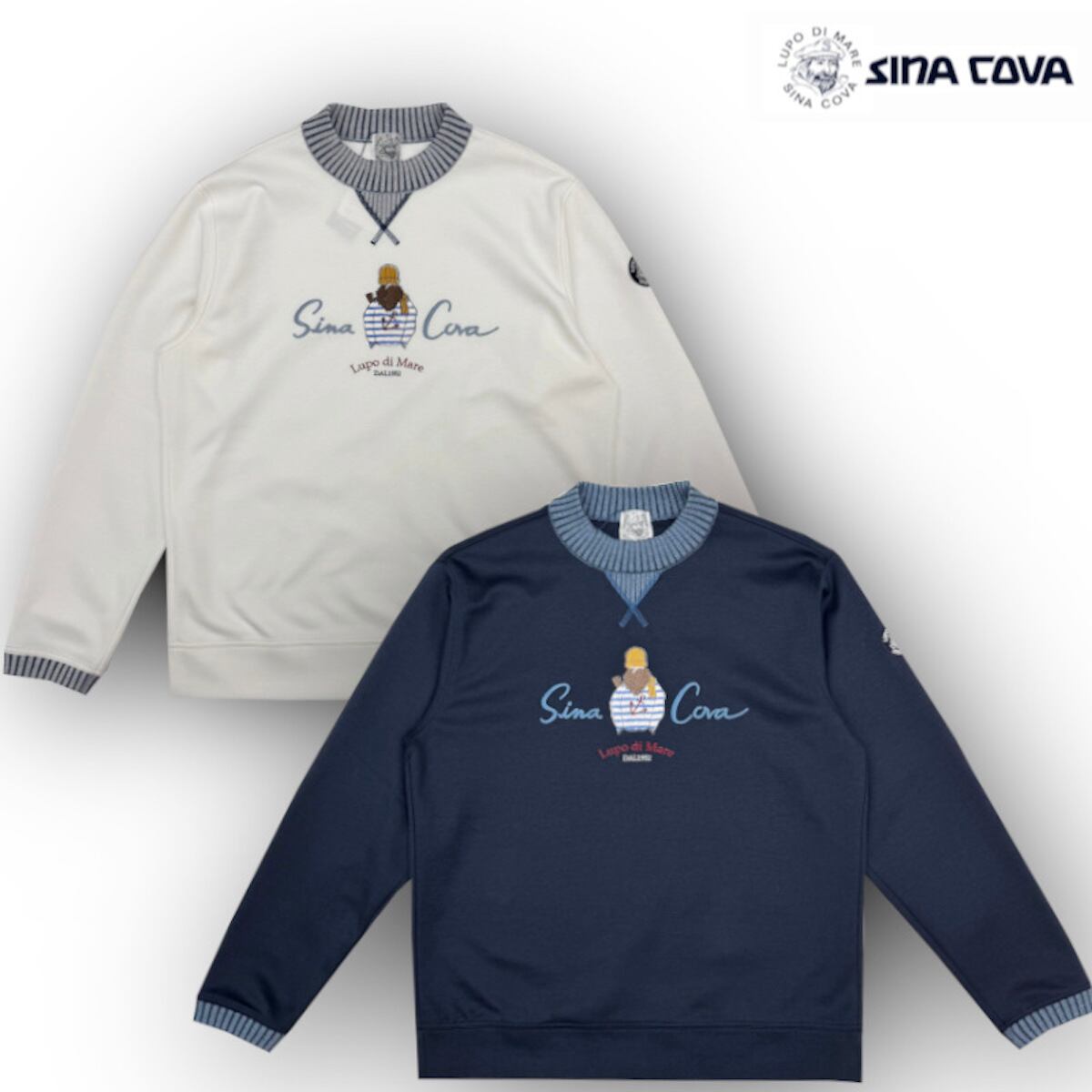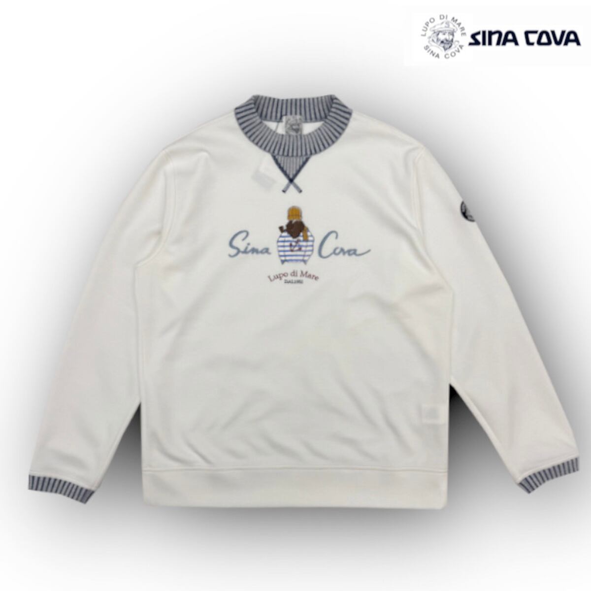 種の選定、栽培、糸の生産に至るまでの基準を吟味したオーガニックコットンとリサイクルポリエステルを使用したこだわりの素材。軽く、適度な張りもあり、風合いも優しい素材です。衿とガゼット部分には、デニムライクな2重臼に配色したニットリブを使用し、衿はリンキングしているため縫い代のごろつきがありません。フロントの船長のモチーフは、手刺しタッチであたたかみを感じるザクザクした感じの刺繍を施しており、1枚でも着映えのする商品です。
